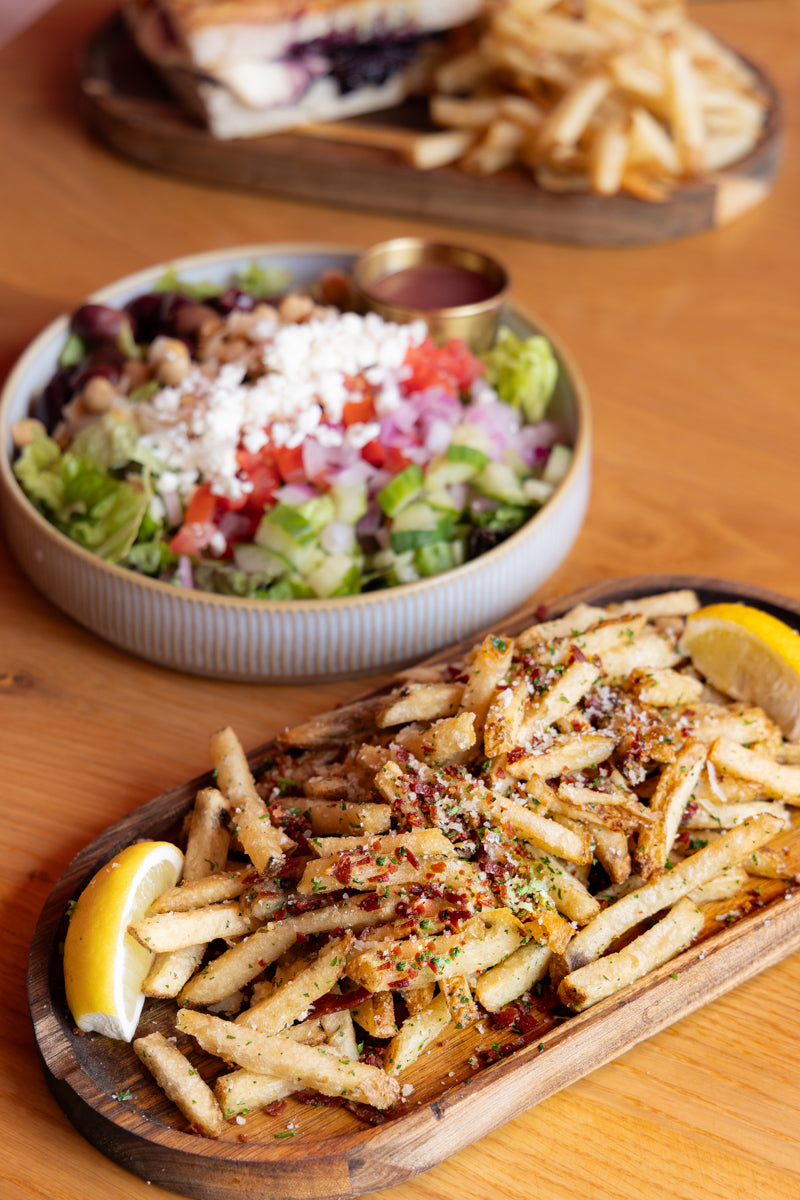 Indulge in our Loaded Mediterranean Fries, a masterpiece of rich Mediterranean flavors and perfectly cooked fries. Enjoy crispy, golden fries topped with savory Crispy Prosciutto for a delightful crunch and meaty goodness. Drizzled with aromatic Truffle Oil, these fries reach gourmet indulgence.