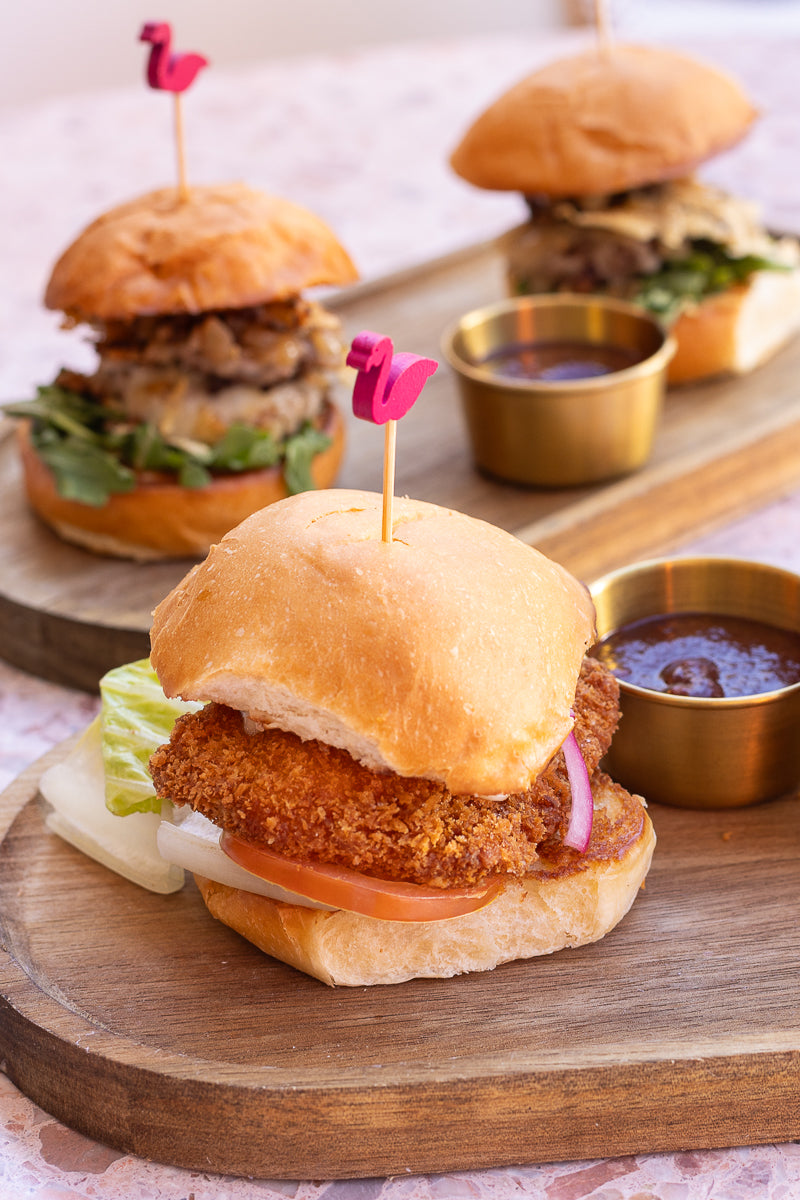 Panko fried Jidori Chicken Breast Sliders, Lettuce, Tomato, Red Onion, +2 MONdiments